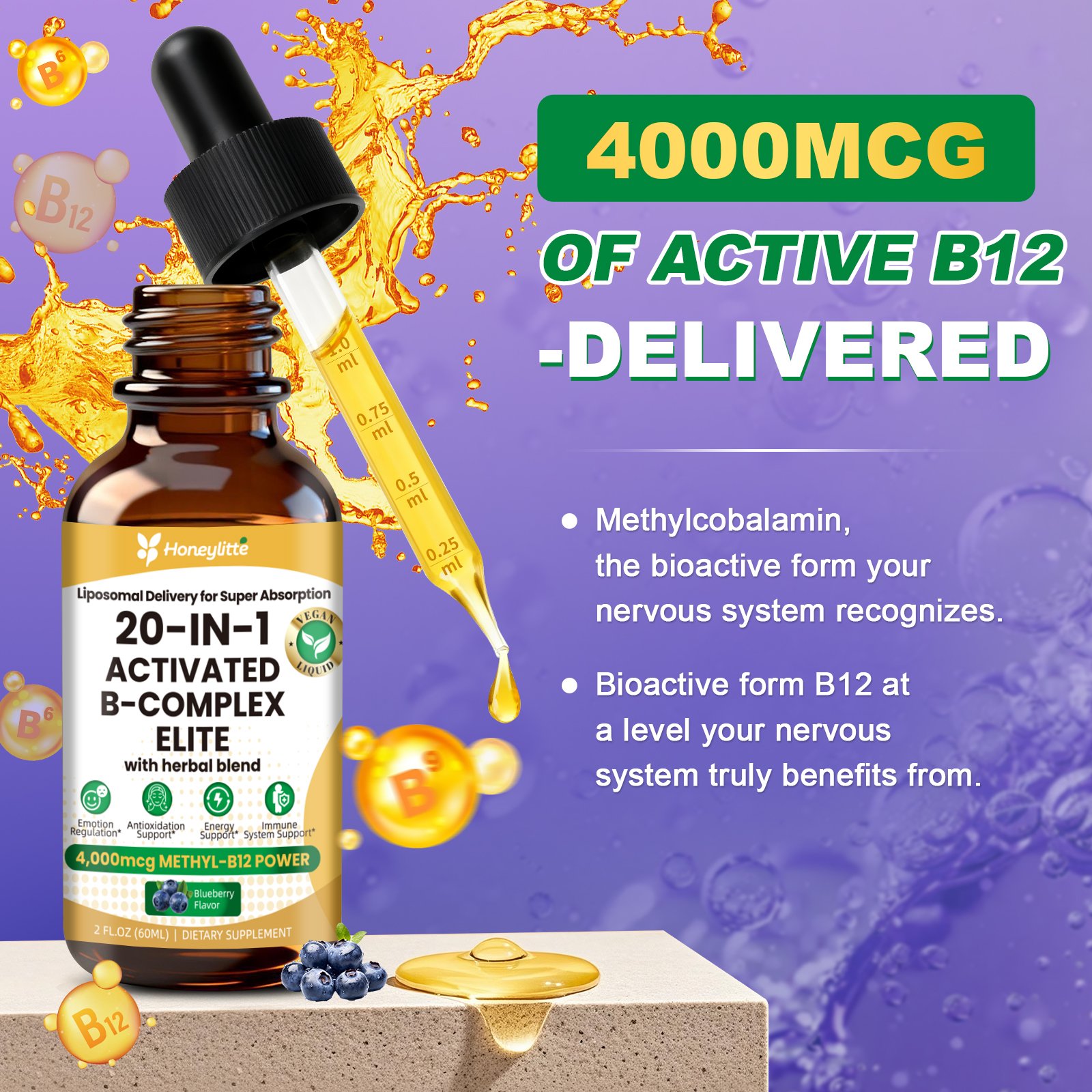 Formulated with 4000mcg of highly absorbable Methylcobalamin B12 and a full spectrum of active B vitamins, this sublingual liquid formula bypasses slow digestive breakdown, absorbing directly into the bloodstream for quicker results. Enhanced with biotin and calming herbal extracts, it supports steady energy, mental clarity, metabolism, and healthy hair, skin, and nails — all in a delicious blueberry flavor that’s easy to take on the go.